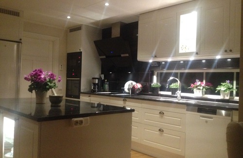 Lower floor; two bedrooms of which one bedroom has exit to the terrace. Living room with wood burning stove and a large sofa with chaise longue and divan as well as backing stairs. The kitchen is modern in open plan layout, equipped with built-in oven, microwave, induction hob and dishwasher. The bathroom is in close proximity to the bedrooms and is fully tiled with walk-in shower.