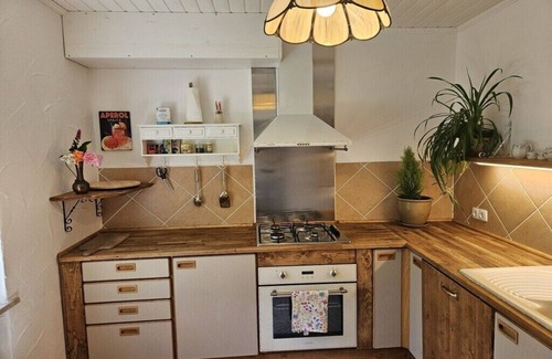 Enjoy a peaceful stay in our charming and family-friendly country house apartment. Renovated with eco-friendly materials such as real wood and clay plaster, a Jotul fireplace, and a large bathtub for relaxing evenings, it offers a truly relaxing atmosphere. The bright, spacious living room, a south-facing terrace with access to the romantic garden with a barbecue area and rose pavilion, and the large playground make it perfect (and not just for children).