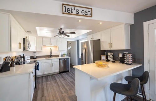 Forget the world in this resort style Old Town Scottsdale house designed for golfing holidays and group getaways! Relax outdoors in a sprawling backyard, with a complimentary heated pool, BBQ and putting green! Challenge friends to a game of golf, or corn hole, or just sit by the sparkling clean, refreshing pool and work on your tan.
