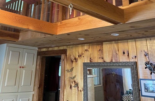 Main living area has a heat pump for air conditioning as well as heat, a TV and an electric heat fireplace nice comfortable seating overlooking the pond. There is an upper loft area over the living room that older kiddos love for sleeping. Throw down air mattresses and enjoy!