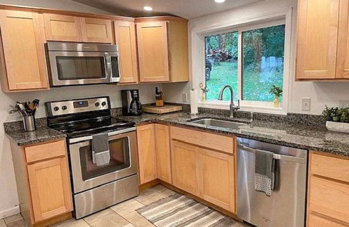 This waterfront cottage has the perfect surroundings for a family getaway! Because it is the last cottage on a dead end, nature is all around you here! There are woods to walk through with a small waterfall and babbling brook that runs alongside the cottage. A long grassy front lawn can be used for all kinds of outdoor activities, and best of all the beach is level with no steps! There is a dock to keep your boat on if you decide to bring one or rent one. The walk out into the water is a fairly gradual one which is great for small children. The best thing about this beach is not only is it level, but there are no weeds growing here in the water so a pleasurable swim is in store. The beach consists of small flat rounded rocks. We also have a rowboat with life jackets you can use if you want to venture out in the lake a bit more!