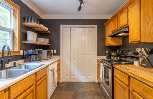 The entire property is newly renovated! Nestled in the lush trees, it features a large wrap-around deck with a hot tub, a giant Weber grill, and dining, lounging, and sitting areas. Plenty of Adirondack chairs circling the fire pit, and many outdoor games keep everyone entertained.