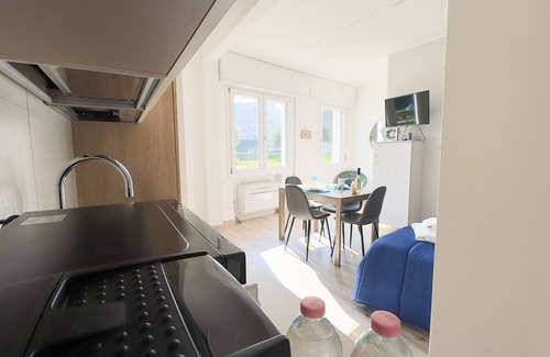 L'Onda blue House Imagine walking through the door of this modern oceanfront studio apartment and being immediately greeted by a feeling of freshness and brightness. The white walls reflect the natural light that filters through the large windows, while the light wooden floor creates a welcoming and warm atmosphere.