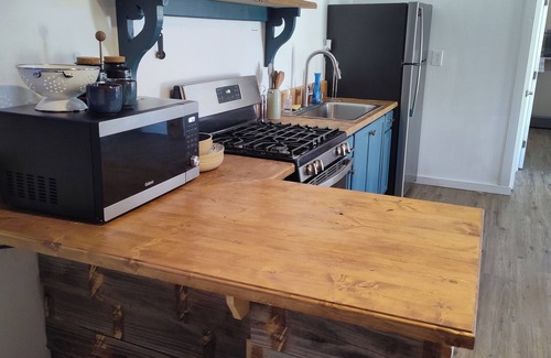This one bedroom cabin is perfect for the whole family with a loft above the living room, a full kitchen, TV, full bathroom, and much more! Enjoy the outdoor fire pit, front porch, high speed WIFI and ample parking!