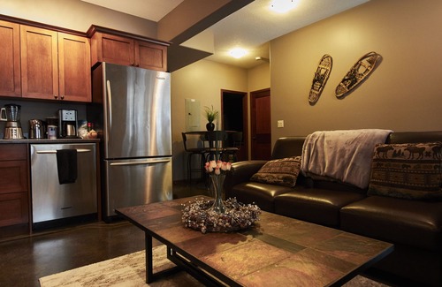 High end one bedroom suite (queen bed) situated at 2432 Fairways Dr. overlooking the golf course on the valley trail. A short 10-15 minute walk to the village or ride the in-resort shuttle provided during the ski season. Beautiful mountain and golf course views from your private patio. Fully equipped kitchen and new queen size bedroom set will enhance your experience. Washer/dryer provided in suite. A luxurious living room complete with electric fireplace and 55" TV will make your stay cozy and enjoyable.