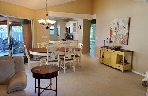 Bella Vista gated community one floor, immaculate condition with open concept living, spacious all season Florida room overlooks private patio.Large master bedroom with ensuite and walk in closet, 2 other good sized bedrooms share a 4 pc bath. Large heated pool, new tennis and paddleball courts and bochi 7 minute walk thru park to the ocean. Minutes to grocery, shopping and restaurants. You will enjoy the serenity away from the hustle bustle but close enough to enjoy the outdoor activities and entertainment that is nearby. Wifi and office desks and monitor makes working vacation a breeze!