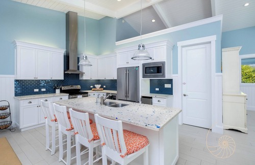 This 3-bedroom, 3-bathroom residence is thoughtfully designed in a coastal-inspired style and filled with natural light. Spacious interiors include a fully stocked kitchen with all your cooking essentials, a dining area with seating for ten, and two inviting living areas. The open floor plan flows seamlessly to the pool deck and covered porch, allowing indoor and outdoor living to merge with ease.