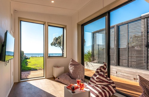 Sleeping up to 6 over 4 rooms, This charming bach has room for everyone. the main building has 2 King bedrooms, with two further rooms which are externally accessed. The first room has bi fold windows that open out to the sea views, perfect for catching the morning sun rise! The two externally accessed rooms are a super king which leads off the rear deck (that can be split into a twin on request ) with an ensuite toilet and hand basin, and a further huge twin sleepout overlooking the sea - and has a wrap around deck. The property offers 1.5 bathrooms, the main bathroom is modern and modest with a shower vanity and toilet and there is a further ensuite toilet in the super king sleepout. There is also an outside hot and cold shower for rinsing off after the beach.