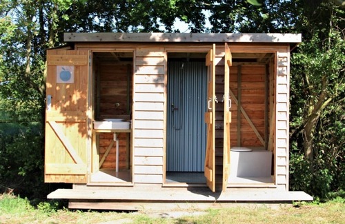 Take the stepping stone path up behind the wagon to find the washing shed with three separate rooms for washing up, showering, and the composting loo.