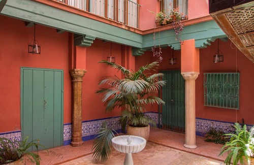 The apartment is located in an old house of the Jewish quarter of Seville, and has been completely restored, although retaining the old air of these eastern houses of Seville. Its pretty columned courtyard, with its ancient fountain always flowing, and full of flowers, palms and ferns, keeps all the essence of the ancient city of Seville.