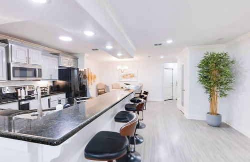 Our Happy Place Oasis is a cozy and inviting home that offers a warm atmosphere, spacious living room, and fully equipped kitchen. The primary bedroom is a serene retreat with a king-size bed, en-suite bathroom, and walk-in closet. The second bedroom is also cozy with a queen-size bed, walk-in closet and separate bathroom with tub . The backyard patio offers stunning views of the lit-up pond at night, perfect for relaxing, and comes with a grill for convenience. We look forward to hosting you.