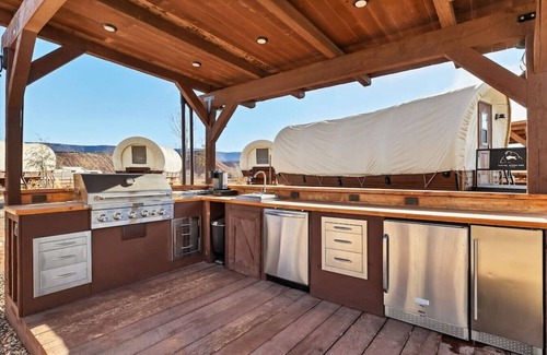 This wagon has 1 King bed and a small table and 2 high back chairs. This wagon has heat and air conditioning. Outside there is a kitchen with a gas BBQ grill with one side burner, a sink, a refrigerator, a dishwasher and an ice maker. Dishes, cups, silverware, cooking utensils and kitchen towels are included in the kitchen.