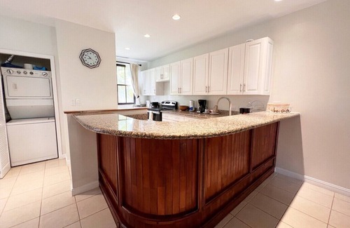 The condo opens to a large, well-equipped kitchen with full-size appliances and breakfast bar seating for 4. You can also serve up a meal in the dining area, with seating for 6. The dining space flows into the large living area with a flat-screen TV and access to the large, covered porch. The outdoor space has a dining table for 4 and a conversation set making it a great lounge space. Enjoy relaxing in the shade or evening games night. Surrounded by large palm trees, the porch feels like a private haven with the cool ocean breeze giving respite from the tropical sun.