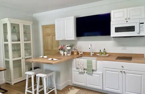 This Studio Guest Apt. has a private entrance yet attached to the main Farmhouse. This cozy one room has 435 SF (sleeps two) with a Queen Bed and foam mattress. Private bath, Free WiFi with Sony OLED TV, equipped kitchen with 2 burner induction cooktop with induction cookware, convection microwave, GE refrigerator, farmhouse sink, butcher block countertop with 2 stools, coffee maker, dishes, glasses, utensils, kitchen gadgets, tall closet, sheets, and towels. Washer/Dryer, laundry soap, ironing board with iron in laundry room which is shared with main house guest . Step outside and relax next to the stocked pond with Adirondack chairs, fire pit, picnic tables, all shared with main house guest. Each reservation comes with a starter pack of toilet paper, paper towels, shampoo, conditioner, bath soap, dish soap, coffee, cooking oil, seasonings, and some condiments. We are a working farm and animal sanctuary with chickens, 2 mini donkeys, & 2 mini cows. We are also developing our food forest. The farm is family friendly yet private as guests enter a long driveway, gated, with security cameras for the safety of our guests and farm animals. You may see Host Susan with small children’s groups teaching about farm animals and children’s literature.