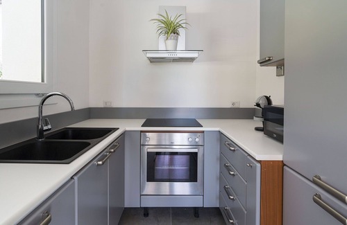 The outdoor space intertwines seamlessly with the tastefully furnished living and dining room on the ground floor thanks to four large French doors. On the ground floor you'll find a bright blue kitchen with dishwasher and one of the two bathrooms.