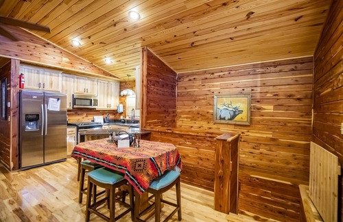 Welcome to our cozy 4-bed, 2-bath log cabin nestled in the forest above the Buffalo River. It's perfect for families and friends. The Living room has a fireplace, sofa, chairs, and flat-screen TV. It has a beautiful, fully equipped, kitchen. Relax on the spacious deck, grill outdoors, or relax at our outdoor Rustic Bar where you can enjoy drinks and snacks while taking in the beautiful surroundings. It's the perfect retreat to enjoy nature's peace and tranquility.