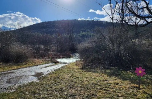 Cross a rustic bridge to get to your off grid Glamping experience with outhouse, minimal 12v solar lighting and propane heat. Or use my generator for an extra charge. No running water, but there's a Coffee pot, fan, hot plate. Story tellin fire ring, small dresser and a queen size bed that begs you to hit the snooze just once more before hiking the trail or headed to Watkins or The Glass Museum. No shower, but you can rent a tiny puppy for a night for a limited time