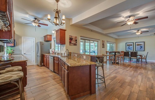 THE PROPERTY You will love the 16-foot ceilings in the great room, providing the perfect lake view as you prepare meals in the modern kitchen. Enjoy your meals in the dining room, where you can seat up to 12, or spread out between the kitchen table, bar, or outdoor dining table. The home features hardwood floors throughout, carpeting in the bedrooms, and durable, stress-free tile in the lower level.