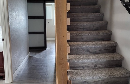 If you need a space to work, you can find a desk in one of the second floor bedrooms, or use the portable table stored in the kitchen on the main floor. There are two bedrooms on the second floor, plus a beautiful bathroom with custom tile and stone shower.