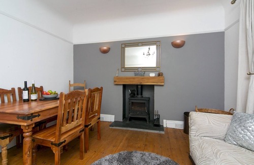 The second room on the ground floor, is a charming dining room with a dining table, comfy sofa, and a log burner, creating a warm and inviting atmosphere for relaxing evenings.
