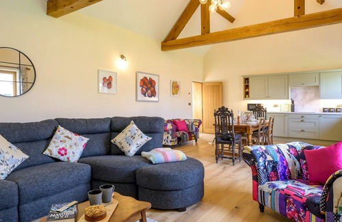 The barn features an open-plan fully equipped kitchen, spacious dining area, and a cosy living room where you can relax after a day exploring the Shropshire hills.