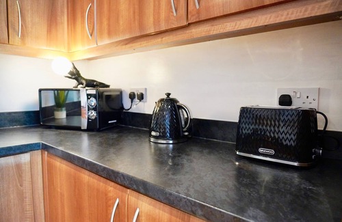 Fully equipped with new appliances and kitchenware, there is an electric hob, oven, microwave, fridge / freezer, dishwasher, and toaster.