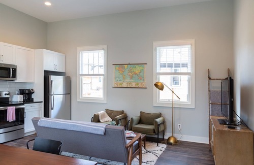 You will have a private entrance with contactless check-in using a unique door code. The door is located on the front of the rear building, meaning you will walk past the main house and to the carriage house. Don't worry, lights will be on along the path and above the door in case you are coming and going at night. All three rooms are in a large room with tall ceilings and ample natural light. In this room, you will find a 50-inch television, a classic record player, a dining table, and a kitchen with all of your basic cooking needs. We will provide tea and coffee packets along with sugar and creamer. You will sleep soundly in our extremely comfortable queen bed surrounded by plenty of natural light in the window-lined bedroom. This room has a standing mirror in case you need to get ready along with a dresser and closet for clothes. IN the closet are extra linens, pillows, cleaning supplies, and the iron and board. You'll also have a small desk to work from. The bathroom is well lit and very spacious. We provide shampoo, conditioner and body wash in a wall dispenser in the shower. There is also a standing washer and dryer with a clothes hamper in the bathroom. Detergent is located under the sink as is the hairdryer.