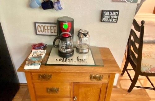 There are two full size dining areas one inside dining area and one outside on the large covered porch. The covered porch also has a sitting area. And a small table which is perfect for drinking your morning coffee or a glass of wine in the evening while watching the birds.