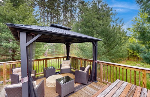 Outside, a spacious deck with patio furniture, a firepit, and a gas grill awaits, providing the ideal spot for al fresco dining or simply enjoying the peaceful surroundings. Explore the lush lawn and garden area, or gather around the firepit for s'mores under the stars.