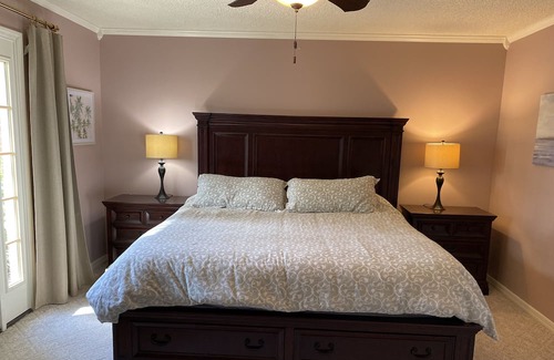 Enjoy a perfect getaway at this centrally-located bright and cheery pond-front ranch home on the 17th hole of the Blue Sky Golf Club golf course and minutes from Jacksonville beaches. Answer the call of the Florida sunshine to come relax under the palms poolside while observing waterfowl pond visitors and golfers chip in from the fairway off the unobstructed views out back. This 3 bedroom, 2 bathroom residential home comfortably sleeps 6, including 1 King, 1 Queen, and 1 Full bed.
