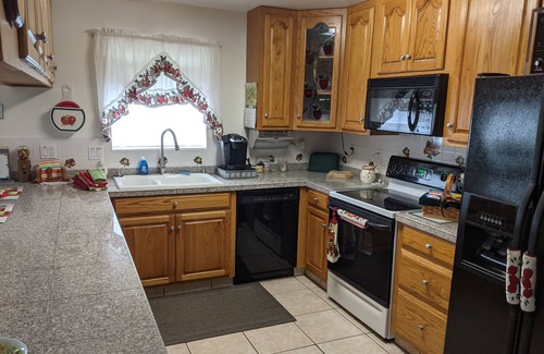 Living Room with recliner sofa and love seat, full kitchen with bar (4 bar chairs), one large bedroom with king size bed, ceiling fan, walk in closet, large bathroom with dressing table, hair dryer and all supplies. Washer and Dryer. Shop Apartment and house is located on 2 acres with no close neighbors. This is a quite neighborhood and friendly people. Ample parking for car/truck and boat. Outside A/C outlet.