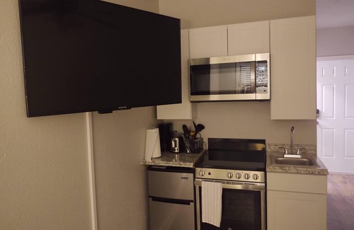 When you come inside, the large totally remodeled bathroom and laundry will be to your left. Down a short hallway, you’ll find the main room of the guest studio. The kitchenette to your right is like a full kitchen, scaled-down! Petite appliances save space while still providing everything you need for your visit. I found a great table that provides enough space for two to dine, and expands to provide a larger space for working if you need it.