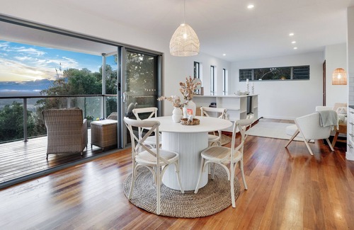 Cooinda Studio features an open-plan living, kitchen, dining, and office nook, all enjoying expansive views of the valley and beyond to the coastline.