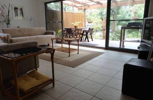 A near-new residence in an attractive, peaceful native bush setting at the edge of the national park and short walk to beach, ocean pool, restaurant, local store, tennis courts and waterfall - spacious open-plan living opens to a furnished all-weather deck with BBQ; air conditioned and fully equipped kitchen, quality comfortable furnishing and appliances with an emphasis on simplicity and comfort - sleeps a maximum of six, two queen beds, two singles and full size cot. Lots to do for kids - bring bikes, boards and tennis rackets - a well stocked bookshelf, board games and DVDs for varying ages and tastes - family dog is welcome providing s/he is house trained and of a size and temperament that poses no threat to local wildlife. Cats and other pets are not permitted.