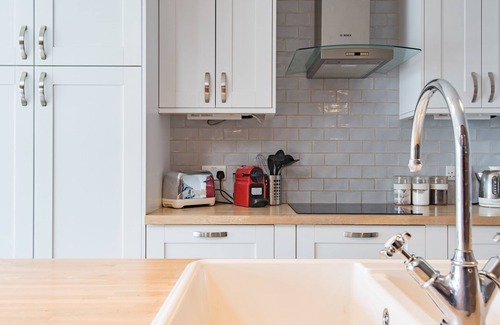 Open plan kitchen & dining area with island, electric oven and hob, microwave, Nespresso Krups coffee machine, fridge/freezer and dishwasher. Dining table seating 8, sofa and smart TV. Bi-folding doors leading to enclosed garden.