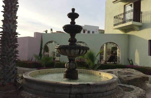 In Spanish, 'fuente' means fountain. Casa Fuente takes its name from the fountain built by Pedregal's founders next to the villa’s south wall. Its soft gurgle greets your arrival, as you gaze out on the Pacific Ocean. Entering the villa for the first time, you pass with eagerness through a massive, wrought-iron gate. This brings you into a lovely tiled courtyard peppered with palms and made fragrant by a lime tree flourishing under the desert sun. Continuing through this courtyard takes you to its immense, wrought iron and glass front door.