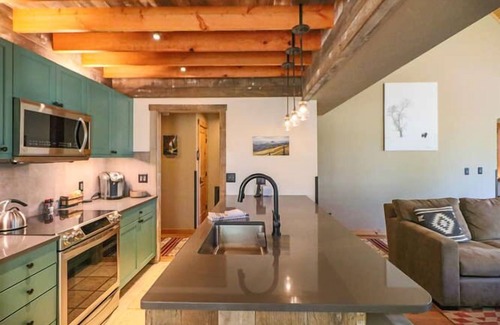 This 2-bed, 3-bath home pairs a rustic industrial design with warm mountain touches and luxury amenities including a steam shower, heated bathroom floors, and a wall mounted boot and glove dryer.