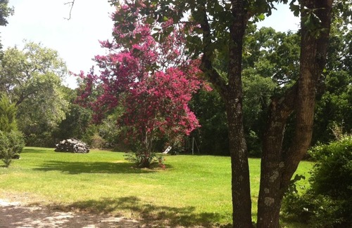 This open concept retreat offers 3 bedrooms and 2 full bathrooms, sleeping 6-8 people. There are enough beds to sleep 6 comfortably and there are also aero beds available upon request for more. Master has a King sized dual adjustable ergonomic bed. Other bedroom has a queen bed, and third bedroom - two twins. Plenty of kitchen space with stainless steel appliances and a gas range for those who enjoy cooking in. A gas is provided grill on the back patio for those who wish to 'grill out'. The spacious den offers a 60 inch TV and plenty of seating for keeping up with the game! A large dining room table offers ample seating for 8 people. Recently refinished hardwood floors(ice storm!) and concrete countertops help put a unique touch to the home. The front patio is perfect for a glass of wine or morning cup of coffee and you are likely to see some of the many deer that wander through the property. At night, enjoy the back patio under the stars or turn on the party lights for a group get together. There is plenty of parking so those arriving in several cars can easily come and go.