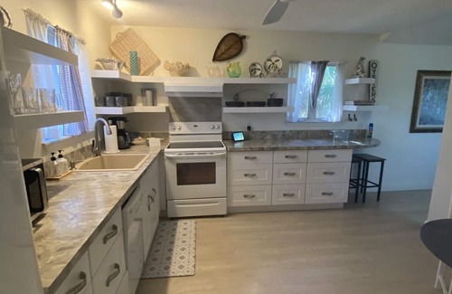 Oyster Bay vacation home with 3 bedrooms, 1 and 1/2 baths, plus an outdoor shower. Sleeps a total of 6. This location is perfect for boaters and outdoor enthusiasts, or those who just want to relax on the deck and enjoy the view. Home is located 500 yards from private community boat ramp available to use and the St. Marks National Wildlife Refuge is across the street. Also available for use are a 4 seater electric golf cart, two beach cruiser bikes, one single kayak and one tandem kayak. Shell Point Beach is a short golf cart ride away and within walking distance. Enjoy sunset views from the screened in porch or deck. Hosts are easily available to reach.
