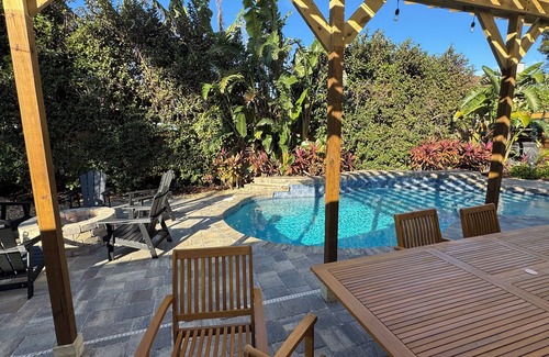 Fully furnished, warm and cozy, non-smoking, dog friendly (pet fee required), 1700 sq ft pool home located in a family neighborhood loaded with beautiful shade trees. This 3 bed/2 bath house sleeps 8 comfortably with a king size in the master, queen size guest, and 4 single bunk beds in the 3rd bedroom. Each bedroom, where you will always find fresh, clean linens upon your arrival, has it's own TV and shutters for privacy. WiFi is accessible throughout the house. The master bath has a double vanity and walk in shower, while the guest bath has a single vanity with a shower bath combo. Bathrooms are kept clean for every guest to enjoy. Spending time together won't be a problem in the spacious great room combined with dining area, adjacent to the kitchen fully equipped with stainless steel appliances and quartz counter tops. The perfect place to enjoy a meal, play some board games, or just relax and watch the 62" TV provided for the living room. French doors lead out to the inviting back patio overlooking the pool with a white light strung pergola. Grill out while enjoying the fire pit in the lush backyard that provides landscaping for complete privacy from the neighbors. Full size washer and dryer are available in the indoor laundry room that leads out to the two car garage. Port Orange provides easy access to Daytona Speedway, white sandy beaches, New Smyrna Beach eclectic shopping, and Orlando attractions. Within minutes from the house is Publix Grocery Store, Walmart, Target, Chipotle, Chik-fil-a, Regal Movie Theater, and other delicious dining. Just over the bridge you will find seafood dining on the water at Deck Down Under, Down the Hatch, Inlet Harbor, or Hidden Treasure. Whether a family vacation, Bike Week trip with friends, long term or executive rental this home is sure to provide you with everything you need in a central location making it easy for any activity.
