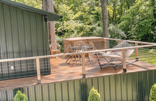 Clean and modern boho style tiny home located on a 5 acre wooded valley lot with no neighbors for privacy! Enjoy a relaxing dip in the hot tub or a much needed evening glass of wine by the cozy camp fire. SmartTV, Bluetooth surround-sound lighting speakers inside and outside, White marble shower w/ 12in rainfall shower head. The loft has a comfy queen size bed and a pull-out futon bed in the living room area. Some things in the area: Hiking and fishing at East Fork Lake, Bowling, Larosas Pizza, Local Brewery with food trucks and more!
