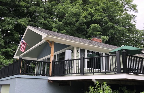 A perfect mountain retreat for two families with kids of any age or a group of adult couples. This spacious and updated vacation home sleeps 12 comfortably with 2 private master suites, a super cool bunkroom and a full bedroom. There are 4 1/2 completely new and clean baths. House boasts hardwood floors throughout and a modern and fully-stocked gourmet kitchen with granite countertops, updated appliances, and a huge custom dining table for family meals. A lodge-like great room with wood fireplace, large screen high definition TV, lots of comfortable seating, and several areas for puzzles and games allows the entire family to do what they want while being together. If you have teenagers who like their own space - there is a large finished basement with a family room, a sleeping room, more game space, another full bath and laundry area. Our custom-made hand shuffleboard table is one-of-a-kind. House has abundant natural light and great views from huge picture windows. Outside, a large wrap-around porch with patio and outdoor seating offers plenty of lounging time alfresco, no matter the season. Long private driveway accommodates 4+ cars.