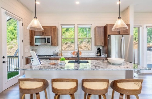 Step inside and you're greeted by the living area filled with natural light and modern mountain charm. The living room features a dramatic wall of windows that brings the outdoors in and frames the lake beyond like a living painting. A plush sofa invites you to sink in and enjoy a movie on the large 55” TV while an electric fireplace adds just the right touch of warmth and ambiance. The kitchen flows seamlessly from the living room and offers everything you need to make meals at home. Upstairs, find a shuffleboard table tucked into a cozy nook where guests can enjoy hours of friendly competition. But the crown jewel of the cabin's indoor amenities is the private heated pool located on the lowest level. No matter the weather or time of year, guests can take a swim in complete privacy and comfort. Free WiFi is also available throughout the property.