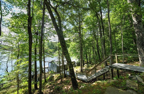 Nestled in a cozy cove, this vintage Maine-style cottage boasts nearly 200 feet of private lakefront and an unbeatable view. The cottage is located directly on the water, providing unobstructed water views, and a deck attached to the dock for easy water access. The water entry is natural and rocky with a sandy bottom that's about 1 foot deep. There is a canoe and paddle boat provided for your leisure, and if you're bringing your own boat the dock can handle up to 10 feet, while the mooring can hold up to 21 feet. The paved driveway is steep, with 12 stairs leading down from the driveway to the cottage. The area surrounding the cottage is level, sunny, and clear. Create everlasting memories with your loved ones, including your furry friend, at this one-of-a-kind destination!