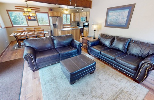 Pet Friendly in Dillon! Summit Ski Chalet is a beautiful 3 bedroom, 2 bath home. Sleeps 6. Private hot tub. Wonderful mountain views from large windows and large decks. It is central to it all. A beautiful slab granite kitchen with stainless appliances. The main level dining area seats 6. Living room has flatscreen, leather furniture and gas fireplace. Big wrap around deck. Lower patio and outdoor room has a private hot tub and gas or charcoal grill. Free WiFi and cable. Mountain and valley views are amazing. Please Note: Only 2 pets allowed. A $300 Pet Deposit is taken on Arrival and is refunded if no damage is found after check-out inspection. This home has many stairs: to access the main entrance, the lower hot tub, deck and patio and to reach the top floor bedrooms.