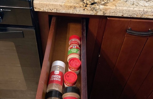 The kitchen has granite counters & gas stove / oven. It is fully equiped including coffee maker, toaster, blender, slow cooker, eletric gritle, microwave, a full complement of pots and pans, silverware and dishes. There's a large pass through to the dining room over looking the seasonal creek.