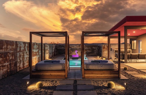 Welcome to your serene oasis in Joshua Tree! This modern retreat features a private pool, luxurious loungers, and stunning desert views. Enjoy a game of pickleball on your private court and bocce ball!