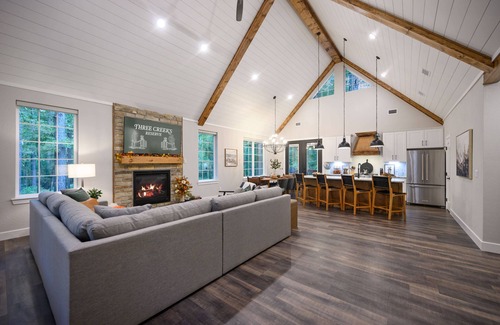 Escape to the tranquility of the woods at Lazy River Retreat, a brand-new, single-story cabin offering 1,805 square feet of modern luxury wrapped in cozy cottage-style charm. This beautifully designed home boasts 3 spacious bedrooms and 3 full bathrooms, making it perfect for families, groups, or couples seeking a peaceful getaway. Set against a serene natural backdrop, Lazy River Retreat provides all the amenities you need for a relaxing and unforgettable stay. LAZY RIVER RETREAT IS NOT A PET FRIENDLY HOME AND ALSO HAS A VERY STRICT NO SMOKING POLICY INSIDE THE HOME. LAZY RIVER RETREAT HAS A STRICT NO THEFT POLICY, INCLUDING ALL LINEN, KITCHEN, AND DECOR ITEMS. Please do not move/remove furniture or decor. All linens, furnishings, and decor make our home special, are our personal property, and are inventoried after each stay. Do not ruin the specialness of Three Creeks Lodge by taking what is not yours and losing your future stay privileges.
