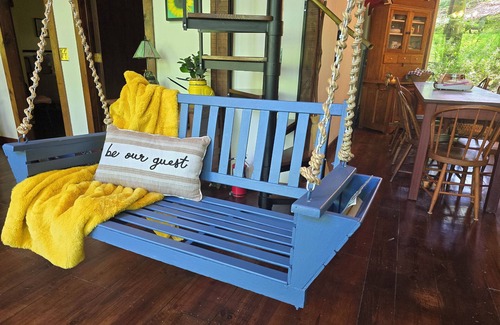 Our location is nestled in the holler, so a mile or two of gravel travel is expected before arrival. The cabin is elevated position above the lake means the driveway and path to the cabin and lake are on a downward slope. There are many steps to the cabin between the graveled driveway and the deck to door, are all well-lit should you arrive at night. The steps on the deck to the cabin door have railings for your safety.