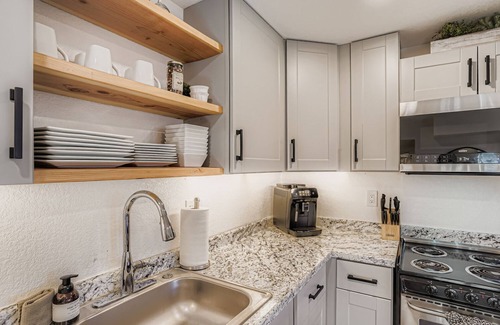 The fully stocked kitchen includes a full-size stove, oven, microwave, blender, and both Keurig and drip coffee makers (pods + supplies provided). You’ll find pantry basics and a cozy breakfast island for two.